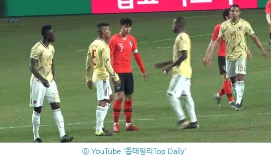 콜롬비아 평가전 경기가 끝난 후 손흥민(26) 선수가 "더 말해 봐"라는 듯한 동작을 취하며 콜롬비아 선수에게 강력히 항의했다.