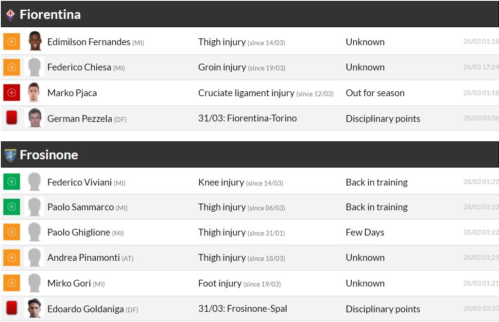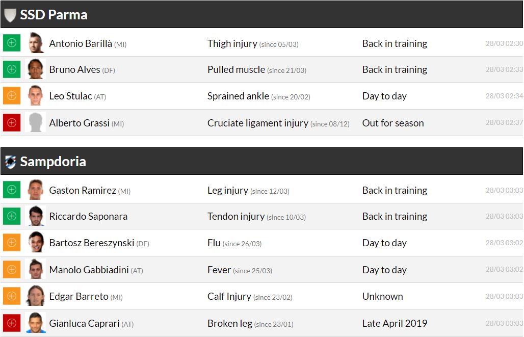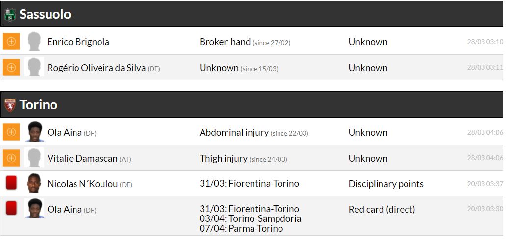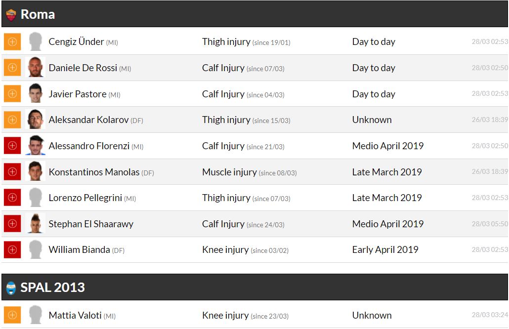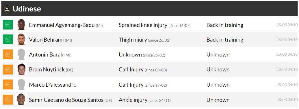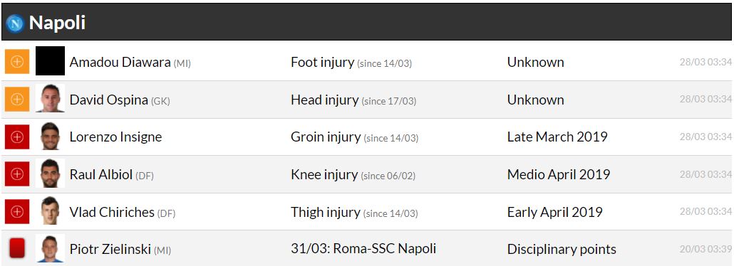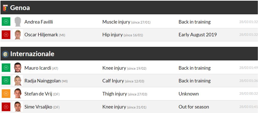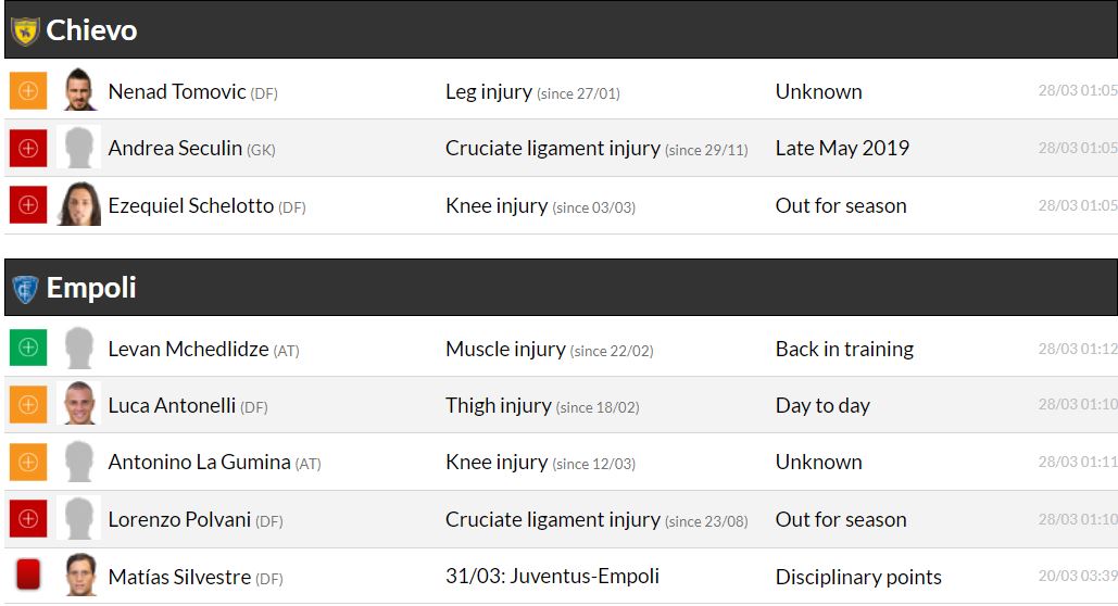 세리에A 29라운드 각 팀 부상자 및 결장 예정 선수