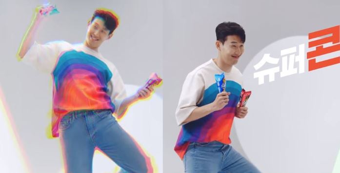 광고 영상 속 손흥민 선수는 두 손에 슈퍼콘을 든 채 '슈퍼콘' CM송에 맞춰 귀여운 춤사위를 선보였다. '슈퍼콘' 컨셉에 맞게 알록달록한 티셔츠도 입었다.