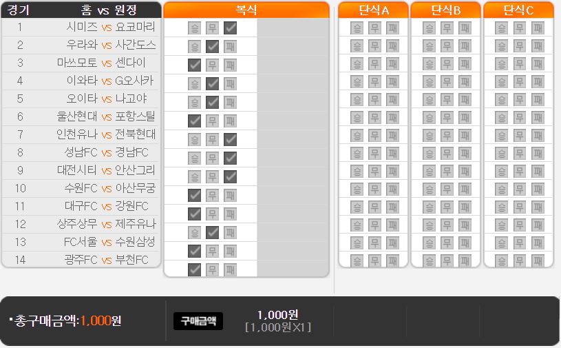 중복 체크 여부: 승/무 쪽으로 방향을 잡고, 광주 승리를 우선 순위로 고려하는 것이 좋아 보인다. 중복 체크 우선 순위는 가급적 미루는 것이 좋다.