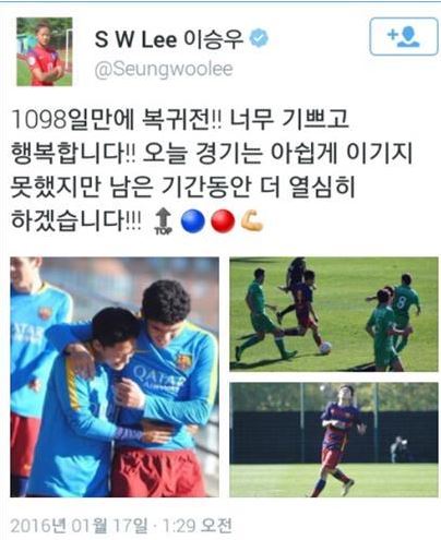 신세대 답다. 이승우가 약 3년 만에 바르셀로나 복귀 경기를 치른 뒤 SNS를 통해 빠르게 소감을 밝혔다. 이승우는 바르셀로나 유니폼을 입고 경기를 뛰었다는 사실 만으로 행복해 했다. 반대로 지난 3년 간 경기를 뛰지 못해 얼마나 답답했을지 되돌아 생각해볼 수 있다. 이승우는 지난 17일 바르셀로나 유스팀 후베닐A 소속으로 스페인 18세 이하 리그인 코르네야와 경기에 출장했다. 교체없이 90분 풀타임을 뛰었다. 아쉽게 득점은 없었고 팀은 이날 0-0으로 비겼다.