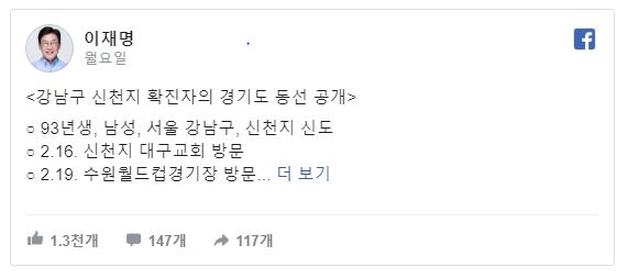 이재명 경기도지사는 2일 페이스북에 신천지 신도인 확진자 A씨(27)의 이동 경로를 공개했다.