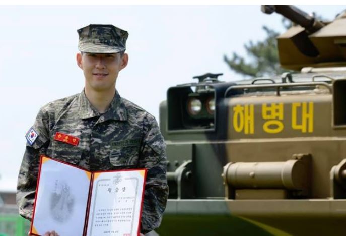 기초군사훈련을 마친 손흥민 선수는 병역법상 보충역으로 별도의 군번을 받으며 최종 계급은 해병 이병이다. 손 선수는 34개월 동안 현역 선수로 활동하면서 일정 기간 봉사활동(544시간)을 이수하면 병역 의무를 마친다.
