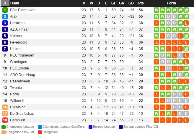 치열한 1위 경쟁이 이어지는 가운데 아인트호벤은 지난 라운드 네이메헨 전에서 3-0 완승을 거두고 1위를 지키고 있다. 공격수 루크 데용은 매경기 득점에 성공하고 있고 과르다도 역시 팀 공격을 훌륭하게 이끌어주고 있다. 헤라쿨레스는 지난 라운드 알크마르 전에서 3-6 대패를 당하고 리그 3위를 유지하고 있다. 거기에 최근 원정 4경기에서 단 1득점도 올리지 못할 만큼 원정 경기에서는 약한 모습을 보이고 있다.
