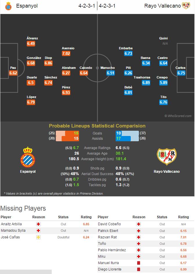에스파뇰은 2연승을 하다 지난 베티스전에서 0-3으로 크게 패했다. 그래도 FW 카이세도와 2선 MF 아센시오의 골과 어시스트 역할을 확실해 보인다. 부상자, 징계자가 거의 없어 상대 보다는 정상적인 경기 운영을 할 것으로 보인다. 라요는 잇몸으로 떼우고 있다. 지난 바르셀로나전에서 1-5로 크게 패했지만 그 전 5경기에서 1승4무로 잘 버텼다. 리그 순위 17위인데 15위 에스파뇰과는 승점 2점 차. 단 이번에는 DF 요렌테, MF 이투라 등 핵심선수들의 징계 결장을 무시 못한다. 최근 맞대결에서 에스파뇰이 5승2무2패로 우위를 점하고 있다.