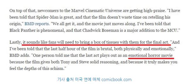 테스트 상영을 본 BMD(BirthMoviesDeath:미국의 영화 사이트)의 제보에 따르면 '시빌워'를 볼 때 준비해야하는 것은 '휴지'였다. BMD측은 "영화의 영화의 후반부는 정신적으로 잔혹하다. 영화를 본 어떤 이들은 엔딩 때문에 시빌워를 '감성 호러 무비'라고 표현하기도 했다"라는 인터뷰를 남겼다.
