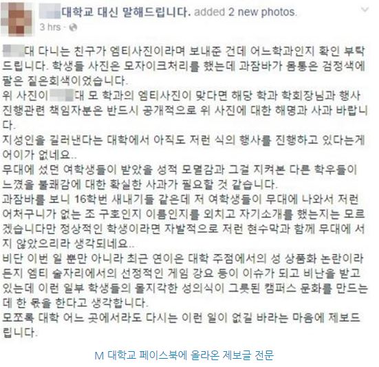 28일 M 대학교 페이스북에는 "M 대학교 다니는 친구가 MT 사진이라며 보내준 사진이다"라며 익명의 제보글이 올라왔다.