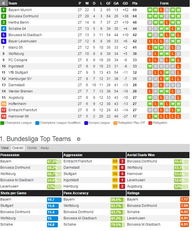 뮌헨글라드바흐는 지난 라운드 살케 전에서 0-1 패배를 당하면서 리그 5위로 순위가 다소 내려갔다. 그러나 뮌헨글라드바흐는 최근 4번의 홈 경기에서 전승을 기록하고 있고 그 중 3경기가 무실점 승리 일만큼 경기력 및 성적이 좋다. 베를린은 지난 라운드 잉골슈타드 전에서 2-1 승리를 거두며 리그 3위를 지키고 있다. 칼루-이비세비치의 2톱 위력은 여전히 좋지만 역시 원정 경기라는 점이 부담이 될 것이다.