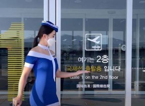영상에서 A씨는 오프숄더에 초미니 스커트 등 신체 노출이 심한 유니폼을 입고 인천국제공항 국제선 안내판 앞에 서 있다.
