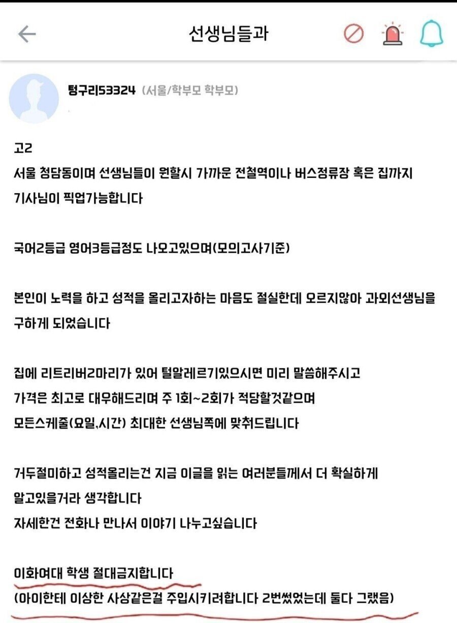 고등학교 2학년 자녀를 둔 한 학부모가 올린 과외 교사 구인 글이 논란이다. 이 학부모가 이화여자대학교 학생의 지원을 받지 않겠다고 강조하면서다.