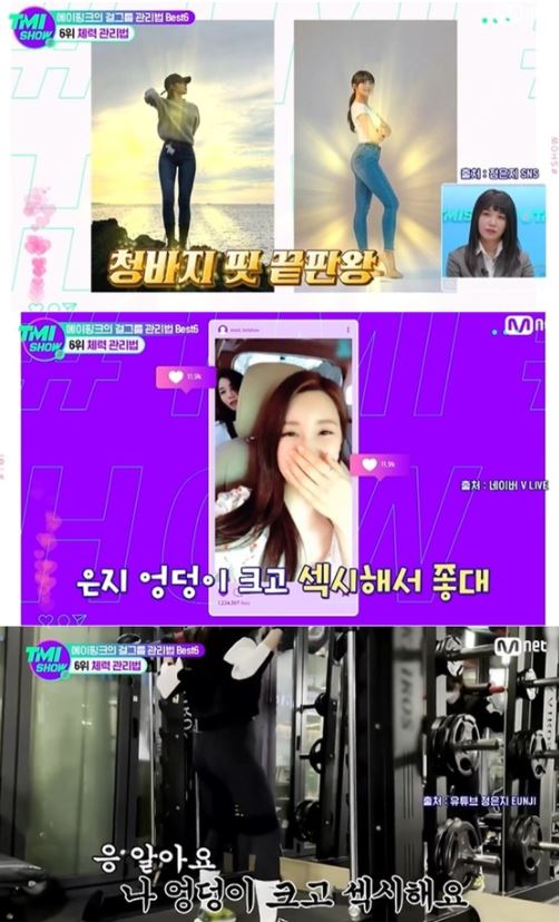 특히 미주는 노력형 운동돌 은지를 가리키며 "평소 꾸준한 자기관리로 우월한 청바지 핏을 보여주고 있다"며 "남다른 몸매로 팬들 사이에서는 '정카다시안'(정은지+킴카다시안)이라 불리고 있다고 한다"라고 소개했다.