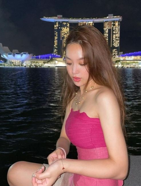 공개된 사진 속에는 김희정이 싱가포르의 랜드마크 중 한 곳인 마리나 베이를 배경으로 포즈를 취하고 있다. 분홍색 튜브톱을 입은 김희정은 구릿빛 피부를 뽐내며 건강한 매력을 과시하고 있다. 한 손으로는 긴 머리를 들어올리며 자연스러운 분위기를 연출했다.