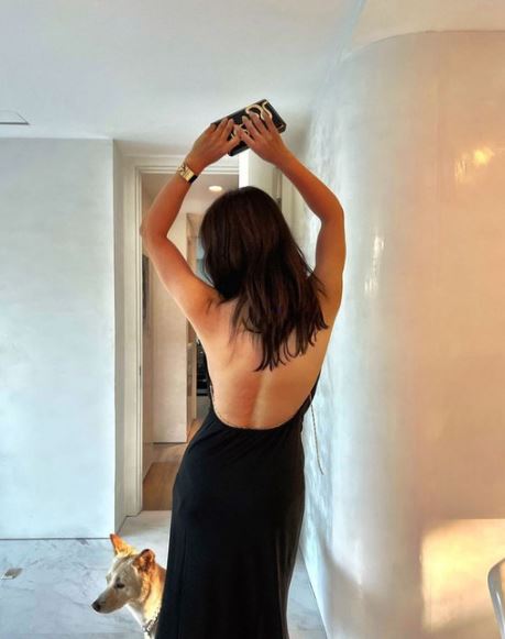 사진에서 엄정화는 반려견 슈퍼 앞에 서서 춤을 추고 있는 모습이다. 그는 등이 훤히 드러나는 검은색 롱드레스를 입고 섹시한 뒤태를 자랑 중이다.