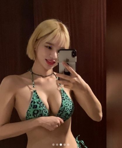 공개된 사진 속 맹승지는 화려한 녹색 레오파드 무늬의 녹색 비키니를 입고 자신감 흡족한 표정으로 셀카를 남기고 있다.