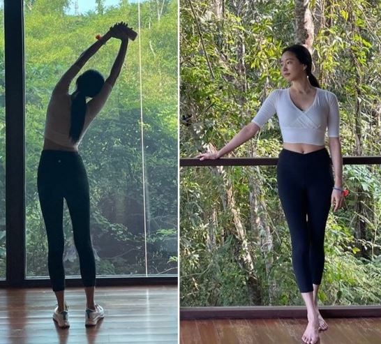 김사랑은 최근 인스타그램을 통해 "정글에서 운동"이라며 근황을 알렸다. 여기에서 김사랑은 숲이 내다보이는 전경을 배경으로 스트레칭을 하고 있다.