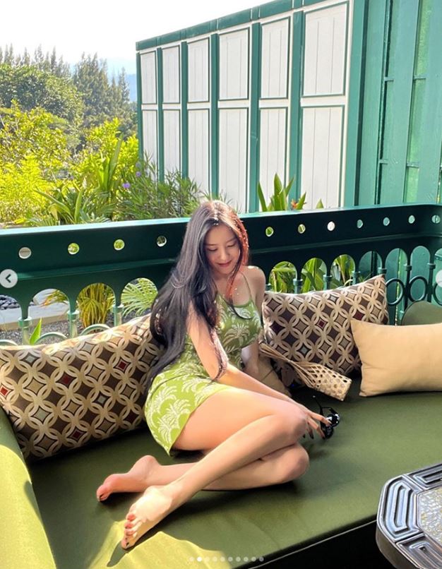 효민은 인스타그램에 "촬영 끝나고 .. 잠시 휴식 ..."이라는 글과 함께 사진을 여러 장 올렸다. 여기에는 등이 드러나는 녹색 야자수 원피스를 입고 갖가지 포즈를 취하고 있는 효민의 모습이 담겼다.
