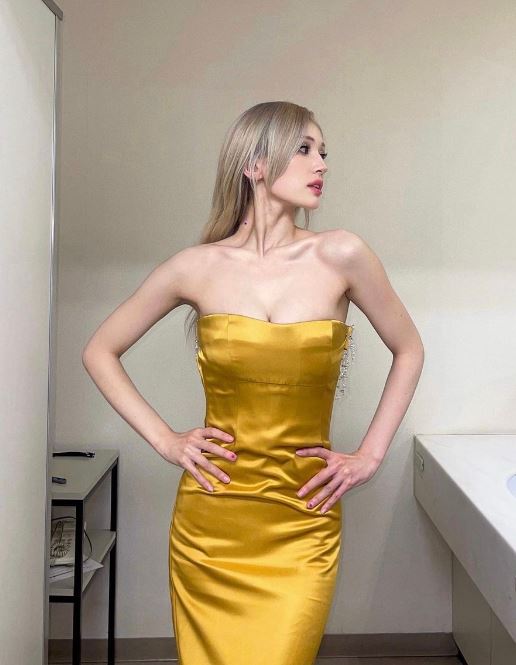 사진 속 전소미는 눈부신 황금빛 드레스를 입고 포즈를 취하고 있다. 튜브톱 디자인이라 전소미의 직각 어깨와 일자 쇄골을 마음껏 뽐낼 수 있었다.