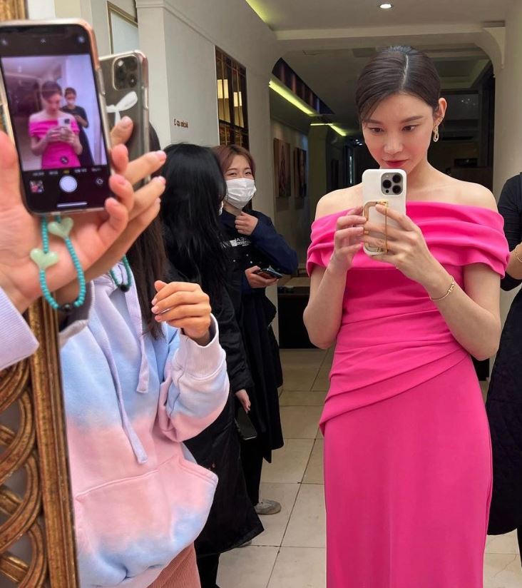 여기에는 핫핑크 색 오프숄더 드레스를 입고 거울 셀카를 찍고 있는 차예련의 모습이 담겨 있다. 이는