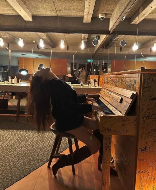여기에는 하의 실종 패션의 소유가 피아노 앞에 앉아 고개를 뒤로 한껏 젖힌 채 연주하는 듯한 모습이 담겼다. 현재 프랑스 파리에서 즐거운 일상을 보내고 있는 소유의 모습이 시선을 사로잡는다.