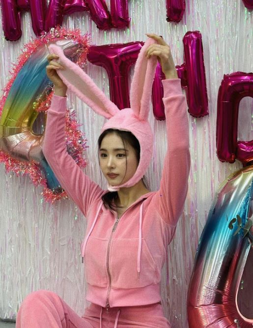 신세경은 뉴트로 무드의 벨벳 소재 핑크색 트레이닝 셋업을 입고 토끼 귀 모양 모자를 착용해 사랑스러운 매력과 더불어 절정의 미모를 뽐냈다.