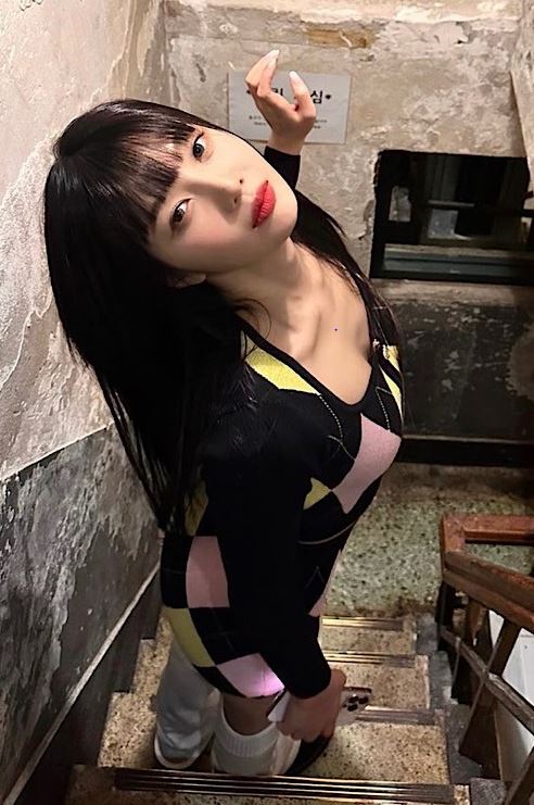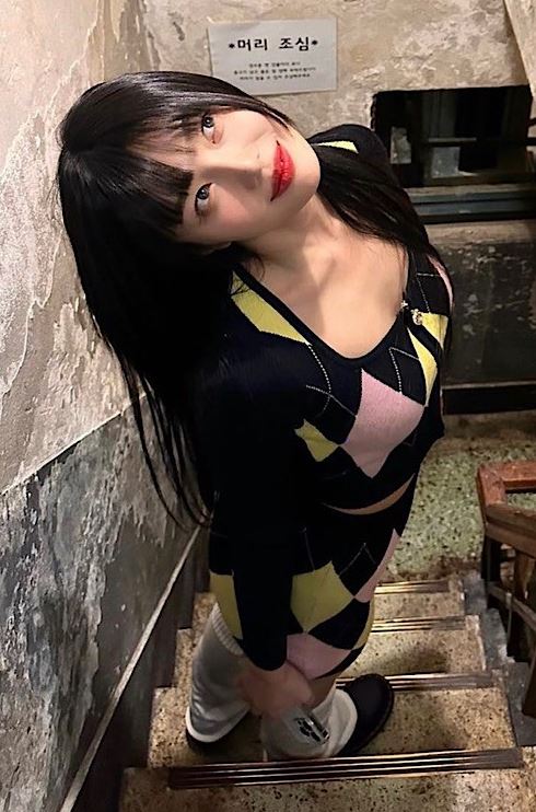 조이는 최근 인스타그램에 이모티콘과 함께 여러 장의 사진을 게재했다. 여기서 조이는 아가일 패턴의 니트 셋업을 입고 위를 쳐다보고 있다.