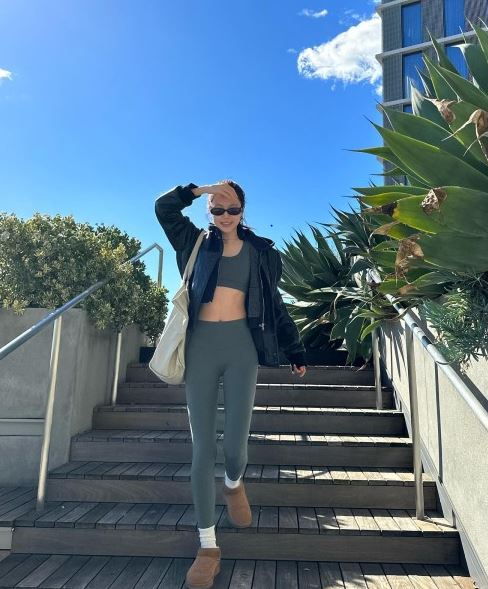 여기서 손나은은 짙은 그레이 브라톱과 레깅스를 매치하고, 블랙 후디를 입어 스포티한 룩을 연출했다. 여기에 블랙 선글라스를 착용해 멋스러움을 더했다. 특히 그녀의 슬림한 몸매가 눈길을 끈다.