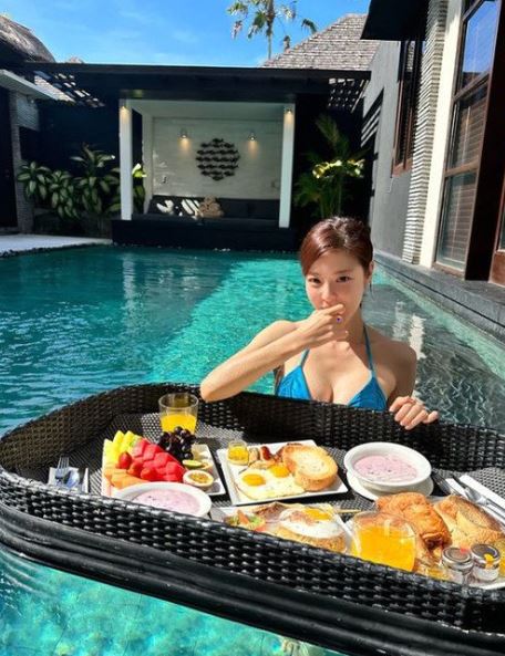 배우 김규리가 수영장에서 아침 식사를 즐기는 모습을 공개했다.