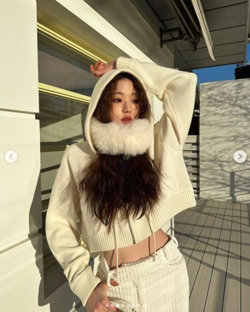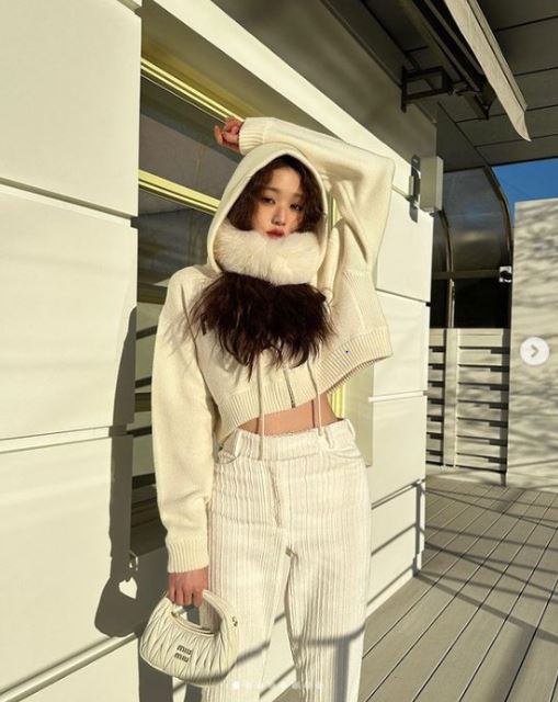 여기서 장원영은 하얀색으로 색상을 맞춘 캐주얼한 스타일의 의상들을 소화했다. 털 목도리와 코듀로이 바지, 크롭트 니트를 입고 여러가지 포즈를 취했다.