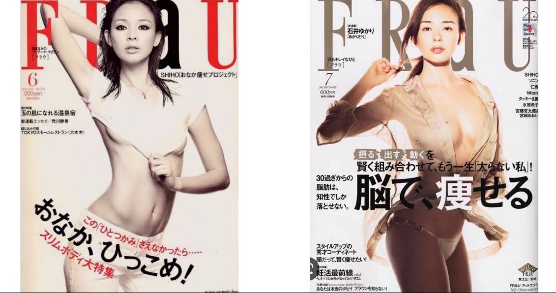 그녀가 공개한 2011년 7월 일본 월간지 '프라우(FRaU)' 커버사진은 극단적으로 짧은 화이트톱에 화이트 팬츠로 늘씬한 몸매를 자랑하고 있다. 또다른 커버에는 가슴이 깊게 파인 상의와 하의는 속옷만 입고 있다.