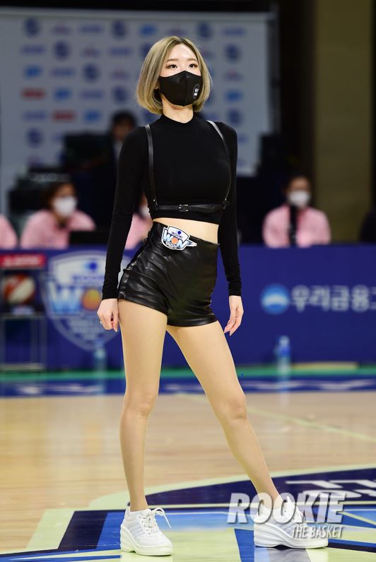 아산에 위치한 이순신빙상장체육관에서 ‘신한은행 SOL 2022~2023 여자프로농구’ 아산 우리은행과 부천 하나원큐의 경기가 열렸다. 서현숙 치어리더가 우리은행을 응원하고 있다.