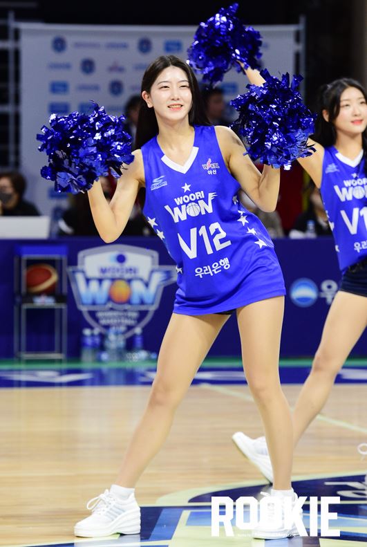 아산에 위치한 이순신빙상장체육관에서 ‘신한은행 SOL 2022~2023 여자프로농구 플레이오프’ 아산 우리은행과 인천 신한은행의 플리이오프 1차전 경기가 열렸다. 안혜지 치어리더가 우리은행을 응원하고 있다.