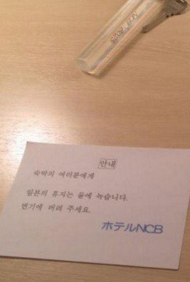 최근 한 온라인커뮤니티에는 일본 호텔에 갔다가 받은 쪽지라며 다음 사진을 담은 게시물이 올라왔다.