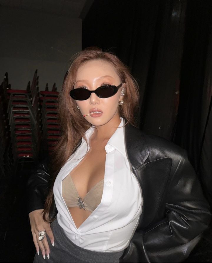 사진 속 화사는 선글라스를 쓰고 가죽 재킷을 입은 모습으로 포착됐다. 하얀 셔츠의 단추를 풀어 속옷이 살짝 드러나는 스타일이었다. 그녀의 풍만한 몸매와 섬세한 각선미가 눈길을 끌었다. 특히 화사는 입에 성냥을 물고 시크한 매력을 뽐내며 세련된 패션 감각을 과시했다.