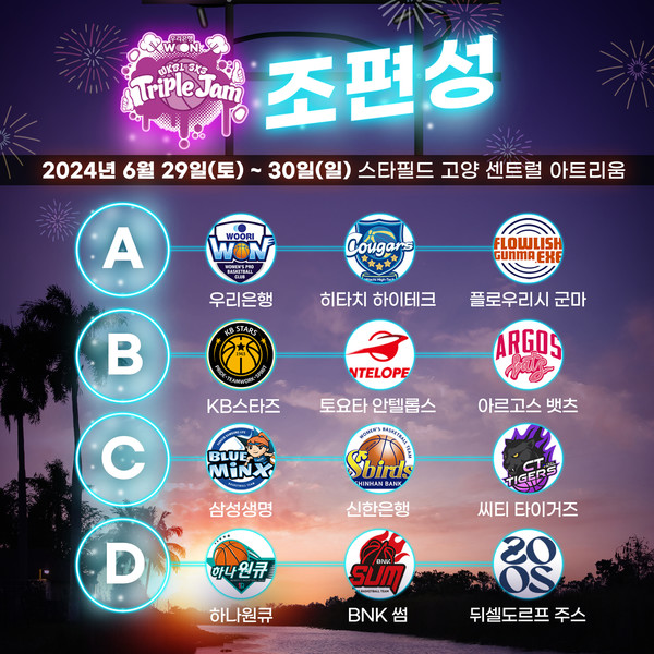 29일(토)과 30일(일) 양일간 스타필드 고양 1층 센트럴 아트리움에서 펼쳐지는 ‘2024 우리은행 우리WON 3x3 Triple Jam(트리플잼)’의 조 편성 및 경기 일정이 확정됐다.