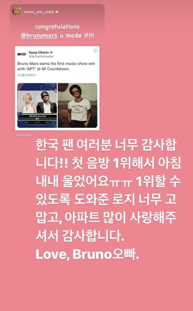 브루노 마스는 10월 25일 자신의 소셜미디어를 통해 Mnet '엠카운트다운'에서 블랙핑크 로제와 함께 부른 신곡 ‘APT.’가 1위를 차지한 소식을 전했다. 그는 “한국 팬 여러분 너무 감사합니다! 첫 음방 1위해서 아침 내내 울었어요ㅠㅠ 1위 할 수 있도록 도와준 로지(로제) 너무 고맙고 아파트 많이 사랑해주셔서 감사합니다”라는 재치 있는 한국어 메시지로 감사 인사를 남기며 눈길을 끌었다. 이어 "Love, Bruno 오빠"라는 말로 친근함을 더했다.