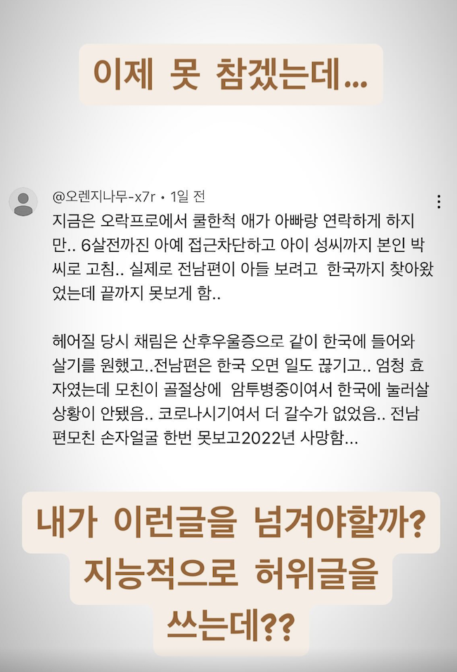 악플러는 댓글에서 “현재는 오락 프로그램에서 쿨한 척하며 아이가 아빠와 연락하게 하지만, 6살 전까지는 아예 접근을 차단하고 아이 성씨를 본인 성인 박씨로 바꿨다. 전 남편이 아들을 보기 위해 한국까지 찾아왔으나 끝내 만나지 못하게 했다”라고 주장했다. 이에 대해 채림은 사실과 다르다고 반박하며 허위사실 유포에 대해 법적 대응 가능성도 검토 중인 것으로 알려졌다.