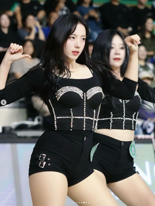 사진 속 하지원 치어리더는 프로농구 원주 DB 프로미의 치어리더로 코트 위에서 열정적인 응원전을 펼치고 있다.