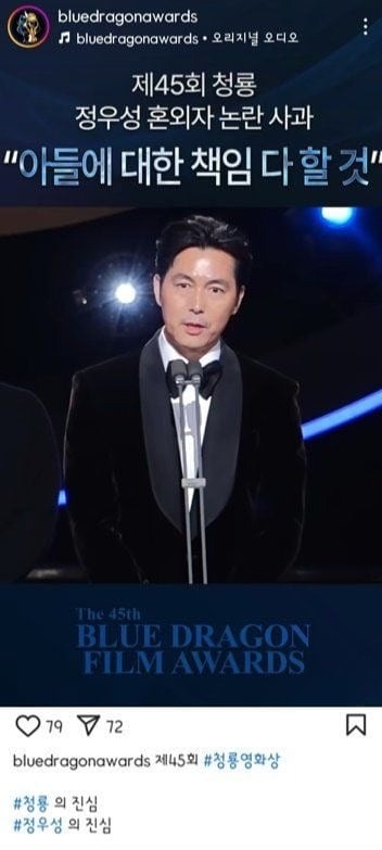 지난달 30일, 청룡영화상 공식 인스타그램 계정에는 "청룡의 진심", "정우성의 진심"이라는 해시태그와 함께 정우성의 영상을 게시했다. 해당 영상은 정우성이 10월 29일 제45회 청룡영화상에서 사적인 논란에 대해 대중에 사과했던 장면을 담고 있었다. 그러나 응원성 해석을 부르는 해시태그가 붙으면서 비난 여론이 일었다.