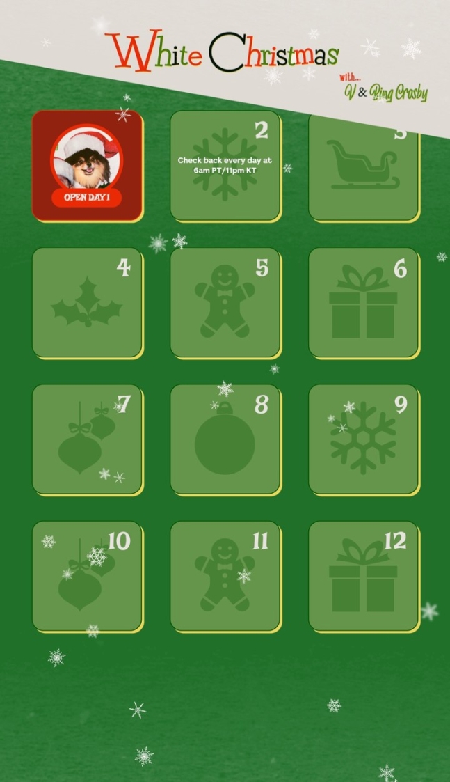 또한 뷔는 'Winter Ahead'에 이어 'White Christmas (with V of BTS)'를 발표할 예정으로, 해당 곡은 빙 크로스비의 명곡을 뷔만의 스타일로 재해석한 버전이다. 이 곡의 발표를 기념해 지난 1일 개설된 공식 홈페이지에서는 총 12개의 콘텐츠가 순차적으로 공개될 예정이며, 팬들의 기대감을 더욱 높이고 있다. 'White Christmas (with V of BTS)'는 12월 6일 오후 2시에 발표될 예정이다.