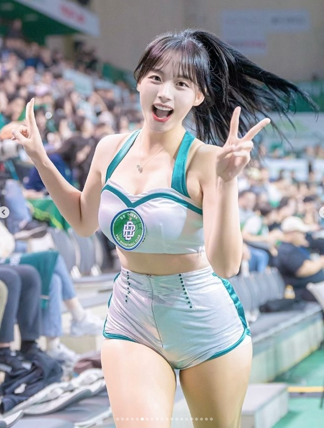 사진 속 하지원 치어리더는 프로농구 원주 DB 프로미의 치어리더로 코트 위에서 열정적인 응원전을 펼치고 있다.
