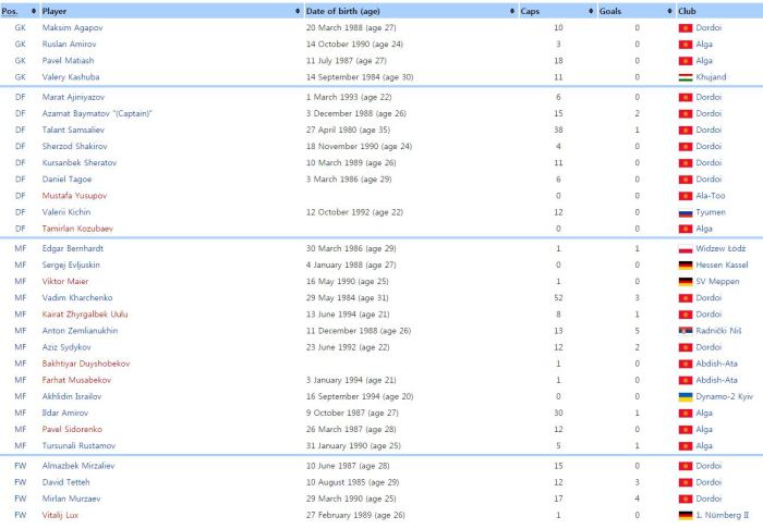 키르기스탄은 8명의 해외파가 있다. 독일, 우크라이나 등 하부리그 소속 선수들이 꽤 있으며 이들이 대표팀의 주축. 월드컵 2차예선 첫 경기 방글라데시전에서 3-1로 완승을 거뒀다. 전반에만 3골을 집중시켰고 후반전엔 가볍게 몸을 풀었다. 호주가 얼만큼의 진정성이 있느냐가 문제다. FW 케이힐(상하이) MF 예디낙(크리스탈) 트로이시(유벤투스) 등 정예멤버들을 모두 뽑았으나 과거 AFC 대회의 경우 장거리 원정서 졸전을 거듭했던 전적이 있다.