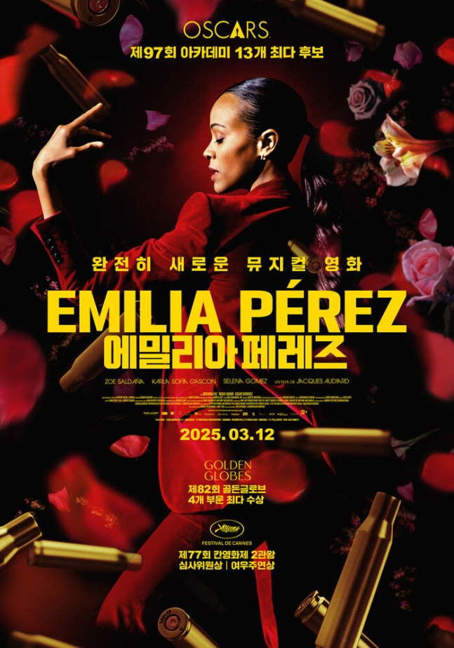 자크 오디아르 감독이 연출한 '에밀리아 페레즈'는 갱단 보스로 살아온 한 남성이 여자로 다시 태어나길 바라며 벌어지는 이야기를 다룬 뮤지컬 영화다. 조 샐다나, 셀레나 고메즈, 카를라 소피아 가스콘 등이 출연했으며, 생 로랑 프로덕션이 제작에 참여했다. 이 작품은 지난해 칸영화제 경쟁 부문에 초청돼 심사위원상과 여우주연상(4인 공동 수상)을 받으며 주목받았다.