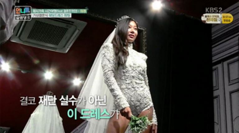 이날 방송에서 제시는 부모님 앞에서 수영복 형태의 하의실종 웨딩드레스를 선보였다.