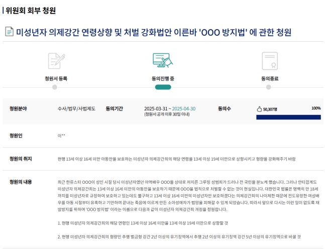 7일 국회 국민동의청원 시스템에 따르면 ‘미성년자 의제강간 연령 상향 및 처벌 강화법안’이라는 제목의 청원이 5만 명 이상에게 동의받아 심사 요건을 충족했다. 이에 따라 해당 청원은 소관 상임위로 회부돼 국회의 공식 논의 대상이 될 예정이다.