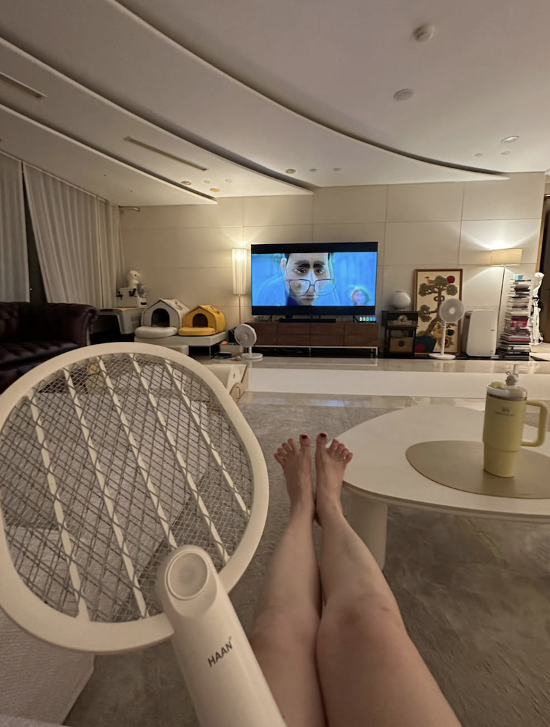 화장기 없는 얼굴에 편안한 티셔츠 차림에도 여전히 아름다운 미모를 자랑한 그는, 특유의 재치와 감각으로 팬들과 친근하게 소통 중이다.