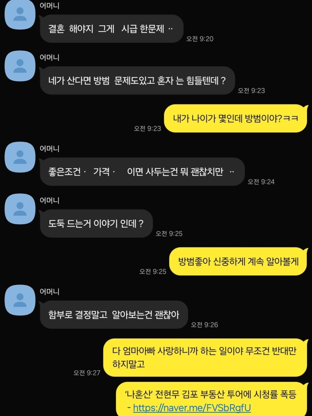 공개된 대화에서 어머니는 “결혼을 해야지 그게 제일 시급한 문제”라며 아들의 앞날을 걱정했다. 이어 “네가 집을 산다면 방범 문제도 있고 혼자 살기 힘들다”고 덧붙이자 전현무는 “내가 나이가 몇인데 방범이야?ㅋㅋ”라며 웃음을 자아냈다. 어머니가 “도둑이 들 수 있다”고 우려를 이어가자 그는 “방범 좋아. 신중하게 계속 알아볼게”라고 답하며 효심을 드러냈다.