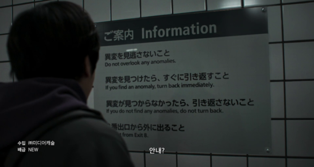 이 작품은 무한히 반복되는 지하 통로에 갇힌 한 남자가 탈출을 위해 8번 출구를 찾아 헤매는 과정을 그린다. 극 중 주인공 ‘헤매는 남자’(니노미야 카즈나리)는 4가지 절대 규칙을 지키며 출구를 향한 여정을 이어가야 한다. ‘이상 현상을 놓치지 말 것’, ‘발견 시 즉시 되돌아갈 것’, ‘아무 이상이 없을 경우 전진할 것’, ‘끝내 8번 출구를 통해 나갈 것’이라는 규칙을 어기면 모든 상황이 원점으로 리셋되는 극한의 상황이 펼쳐진다.