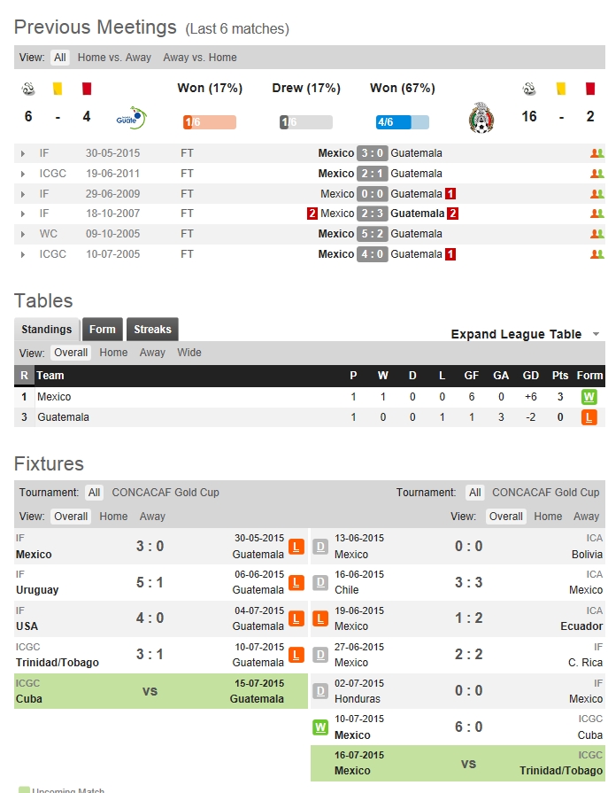 과테말라는 1차전 트리니다드토바고전에서 1-3으로 패했다. 전반에 3골을 내리 허용한 것이 패인이었다. 후반에 교체 카드를 통해 분위기를 바꿨지만, 1골을 따라가는데 그쳤다. 과테말라는 수비 조직력에서 허점을 보였다. 멕시코는 골드컵 5회 우승팀 다운 저력을 보여줬다. 1차전 쿠바전에서는 마음껏 공격을 하면서 6-0 대승을 거뒀다. FW 페랄타는 해트트릭을 기록했다. 최근 맞대결에서는 멕시코가 4승 1무 1패로 앞선다.
