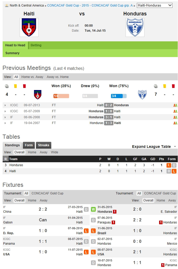 두 팀은 현재 1무 1패로 승점 1점을 기록하고 있다. 아이티는 2차전 미국전에서 0-1로 패했다. 아이티는 미국을 상대로 밀리지 않는 모습을 보였지만 결정력이 부족했다. 미국 골문을 여러차례 위협했지만 공격진의 슛 정확도가 매우 떨어졌다. 온두라스는 파나마와의 2차전에서 1-1로 비겼다. 파나마가 1명이 퇴장당했지만 숫적 우위를 살리지 못했다. 최근 맞대결에서는 3승 1패로 온두라스가 앞선다.