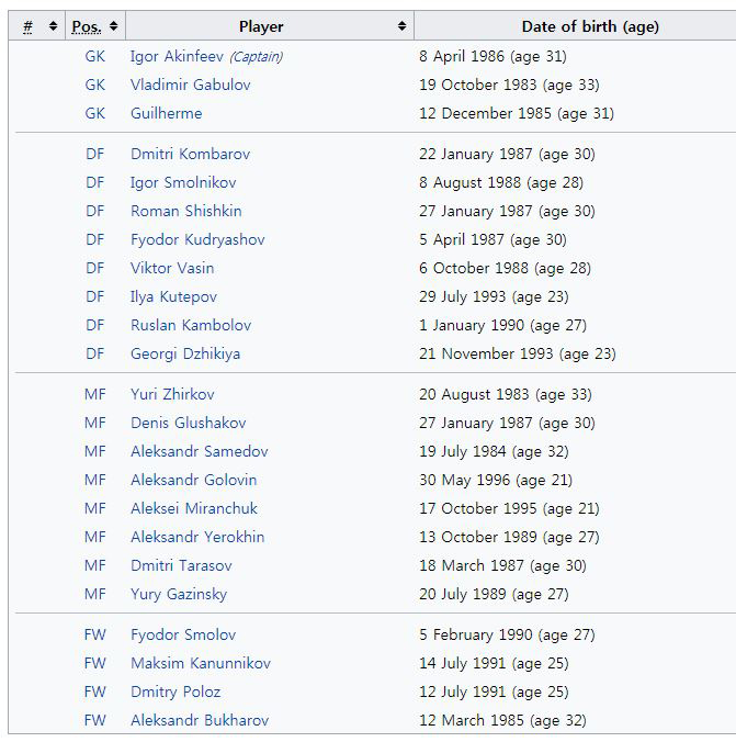 컨페더레이션스컵 출전 명단의 가장 큰 특징은 FW 코코린 MF 자고예프 DF 베레주스키 등 익숙한 얼굴들이 세대교체, 부상 등의 이유로 빠져있다는 점이다. 현 러시아는 GK 아킨페예프(CSKA 모스크바) MF 지르코프(제니트) 사메도프(스파르타크M) 등을 제외하면 A매치 경험이 부족한 선수들이 많다. 덧붙여 23명 전원이 자국리그 선수들로 채워져 있다.